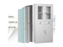 设计上特别考虑了厂里的需要。它采用了“上玻下铁”的样式:上面是透明玻璃门,里面放的文件、物品一眼就能看到,省得翻来翻去找;下面是带透气小孔的铁门,里面放些东西也能透透气,尤其放些有点味道的物件也合适。四个门都是推拉式的,开关顺滑,不占前面过道的地方,特别适合空间不太宽敞的工位或者走廊边上放。