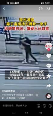 12月9日,广东某市某地发生一件案子。男子当街拽拉一个身穿黑衣的女子。面对又甩又踢,奋力反抗的女子,男人掏出尖刀,狠狠捅了过去。一刀比一刀狠,一刀比一刀重!直至把对方逼到墙角,见对方疼得瘫倒在地,呻吟不止,男子仍不停手,像对待仇人一样,猛地朝对方后背又插了几刀!