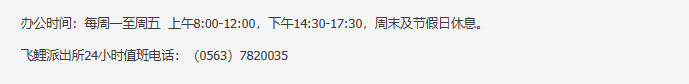 安徽省郎溪县飞鲤镇派出所24小时值班电话信息来源于安徽省郎溪县政府网站公开之内容,整理转载此文是出于传递更多便民服务信息之目的。若有来源标注错误或者其它差错或侵犯了您的合法权益,请与本网站联系,我们将及时更正、删除。以上内容如有变更,以相关部门的更新内容为主。谢谢。
