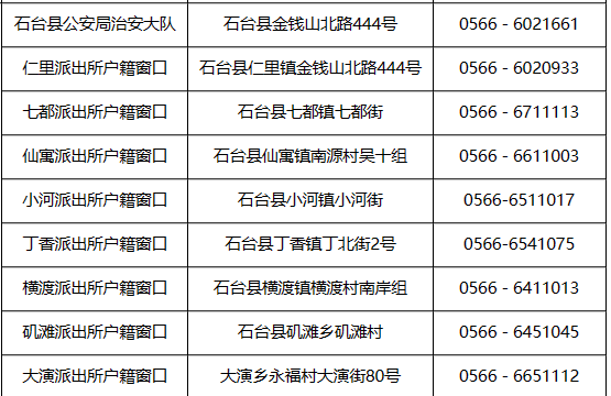 石台县各派出所户籍窗口(户口、身份证)联系电话及地址: