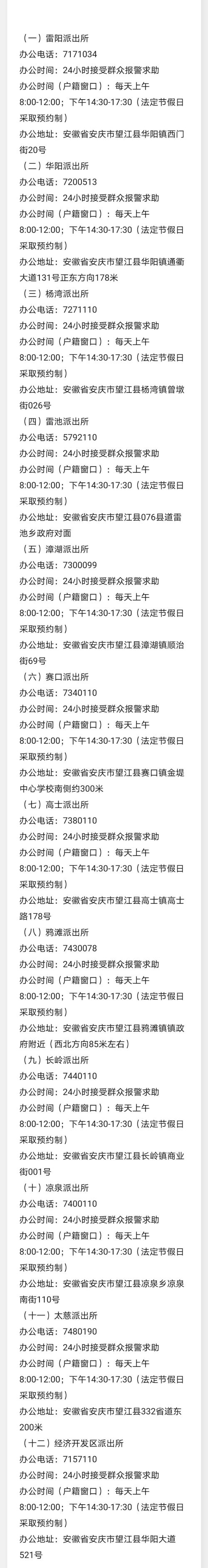 提示:安徽望江县各派出所办公电话及地址信息来源于望江县政府网站公开之内容,整理转载此文是出于传递更多便民服务信息之目的。以上信息仅供参考,由于时间及其他方面的原因可能会发生变动,不准确之处请原谅!若有来源标注错误或者其它差错或侵犯了您的合法权益,请与本网站联系,我们将及时更正、删除。以上便民信息内容如有变更,以相关部门的更新内容为主。谢谢。