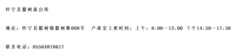 便民信息公开:安徽怀宁县腊树派出所办公电话是多少。
