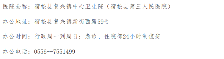 宿松县复兴镇中心卫生院(宿松县第三人民医院)办公电话及地址: