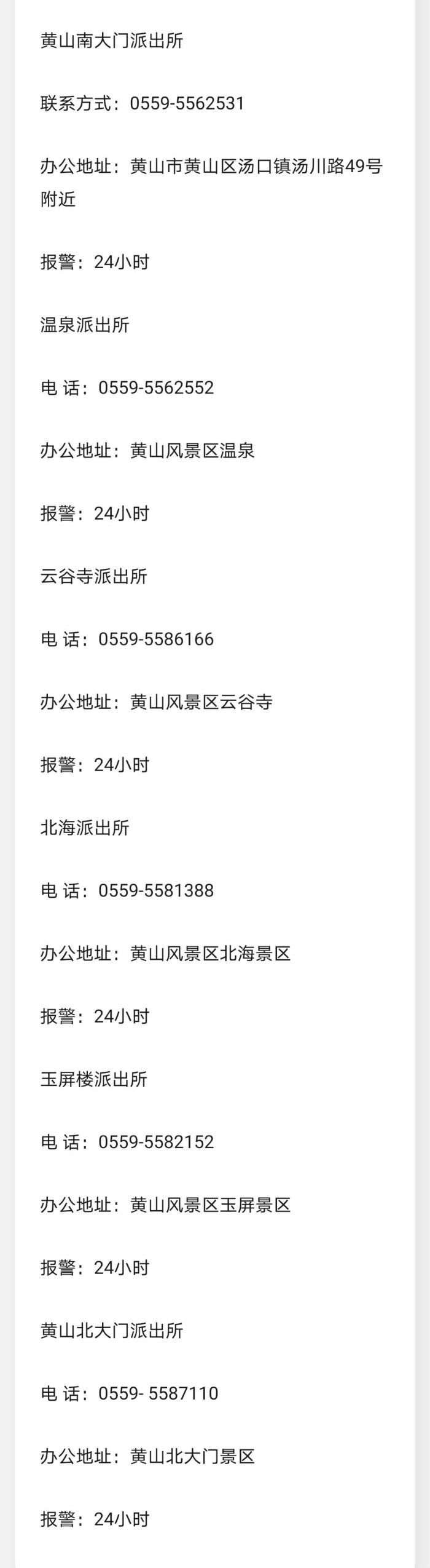 黄山市黄山风景区派出所值班电话和办公地址信息大全表: