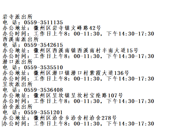 安徽黄山市徽州区辖区派出所值班电话和办公地址信息一览表: