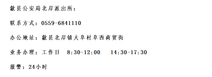 黄山歙县北岸派出所办公电话号码和办公地址: