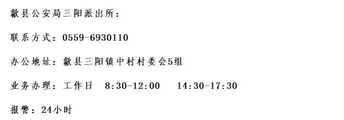 便民黄页:安徽歙县三阳镇派出所的联系方式是多少。