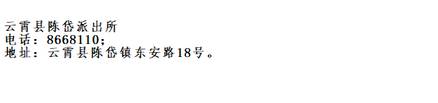 便民黄页:漳州市云霄县陈岱派出所的单位办公电话及地址。
