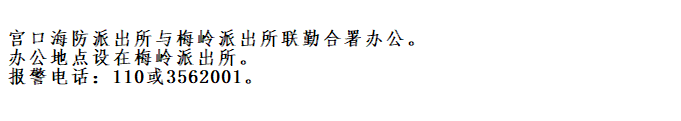 诏安县宫口海防派出所与梅岭派出所的值班电话号码是多少:如需求助或办理其它相关业务,请按辖区划分到对应派出所办理。派出所将竭诚为您服务,欢迎广大群众对诏安县派出所工作予以监督。