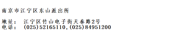 提示:关于南京市江宁区东山派出所的联系电话号码的信息作出提示,本信息仅为提供便民服务目的而发布,相关信息来源于公开信息或第三方。本信息仅作参考,信息的准确性和完整性在此不作任何保证,也不保证所包含的信息和建议不会发生任何变更,我们仅对公开资料中的内容做原文提取或者整理转载。虽然已力求信息的客观完整,但随着时间与其它情况发生,难免信息出现差错或者变更。如果出现差错或者侵犯了您的权利,请通知本网站客服,我们将及时更正或者删除。谢谢。