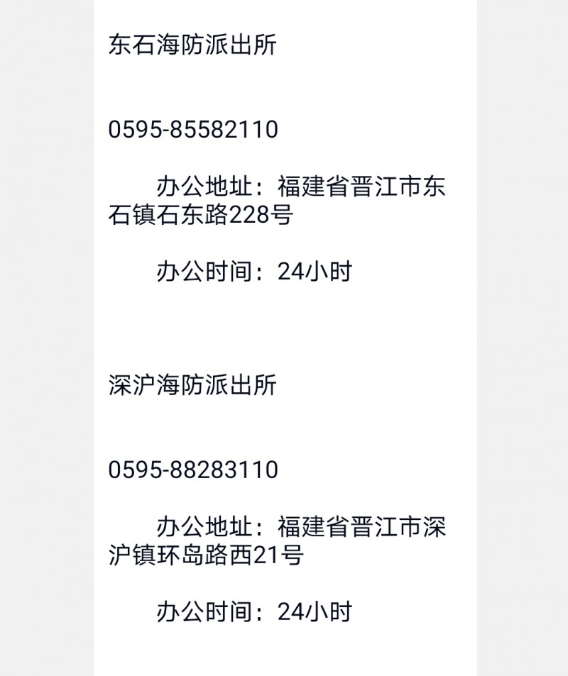 晋江市东石海防派出所、深沪海防派出所的值班固定电话号码是多少: