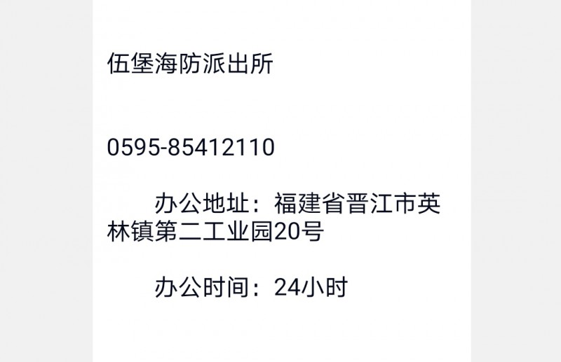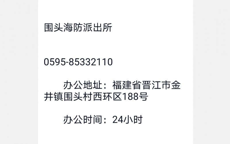 提示:关于晋江市伍堡海防派出所、围头海防派出所值班电话号码的信息作出免责提示,本信息仅为提供便民服务目的而发布,相关信息来源于公开信息或第三方。本信息仅作参考,信息的准确性和完整性在此不作任何保证,也不保证所包含的信息和建议不会发生任何变更,我们仅对公开资料中的内容做原文提取或者整理转载。虽然已力求信息的客观完整,但随着时间与其它情况发生,难免信息出现差错或者变更。如果出现差错或者侵犯了您的权利,请通知本网站客服,我们将及时更正或者删除。谢谢。