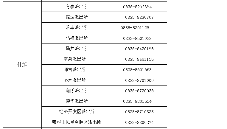 四川德阳什邡市辖区派出所对外服务值班电话号码一览表: