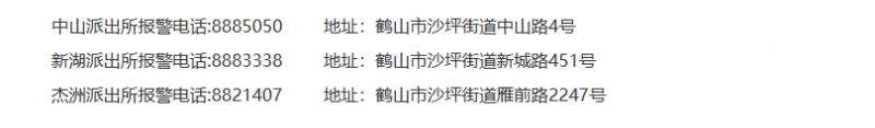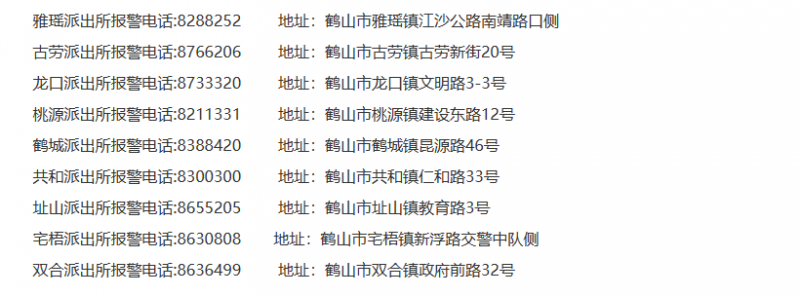 便民黄页:鹤山市各派出所联系电话号码信息一览表。