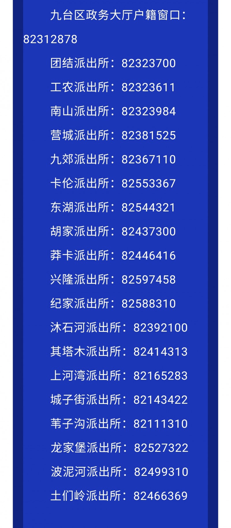 免责声明:关于长春市九台区各派出所户籍窗口咨询电话号码大全表的信息作出免责声明,本信息发布的目的仅为向公众提供更多的便民利民服务,是建立在公共服务信息基础上的公益信息传播,其信息来源于当地主管机构网站的公开内容。信息不排除因随着时间或者相关情况发生原因而发生变化变更,所以本信息仅作参考。本信息旨在通过网络提供更多相关便民利民服务信息,本信息的真实性以相关部门正式披露信息为准。如有错误之处或者如有侵权,请及时联系本网站客服,定会及时修改或者删除。