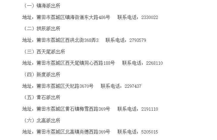 莆田市荔城区各个基层派出所地址和联系电话信息一览表: