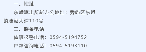 莆田市秀屿区东峤派出所办公地址和值班电话、户籍咨询电话: