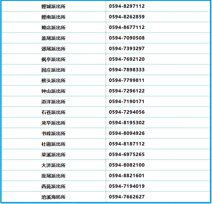 仙游县全县各个派出所户籍窗口咨询预约电话大全表: