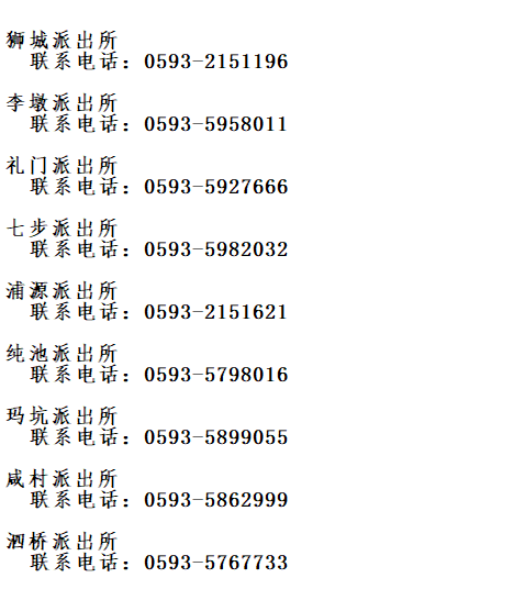 福建周宁县各个派出所户籍窗口服务电话号码大全表: