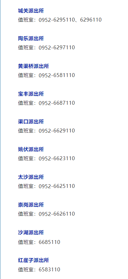 平罗县各辖区派出所值班室电话号码大全表: