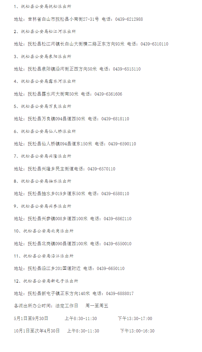 信息公开:吉林白山抚松县各辖区派出所值班电话号码和办公地址。