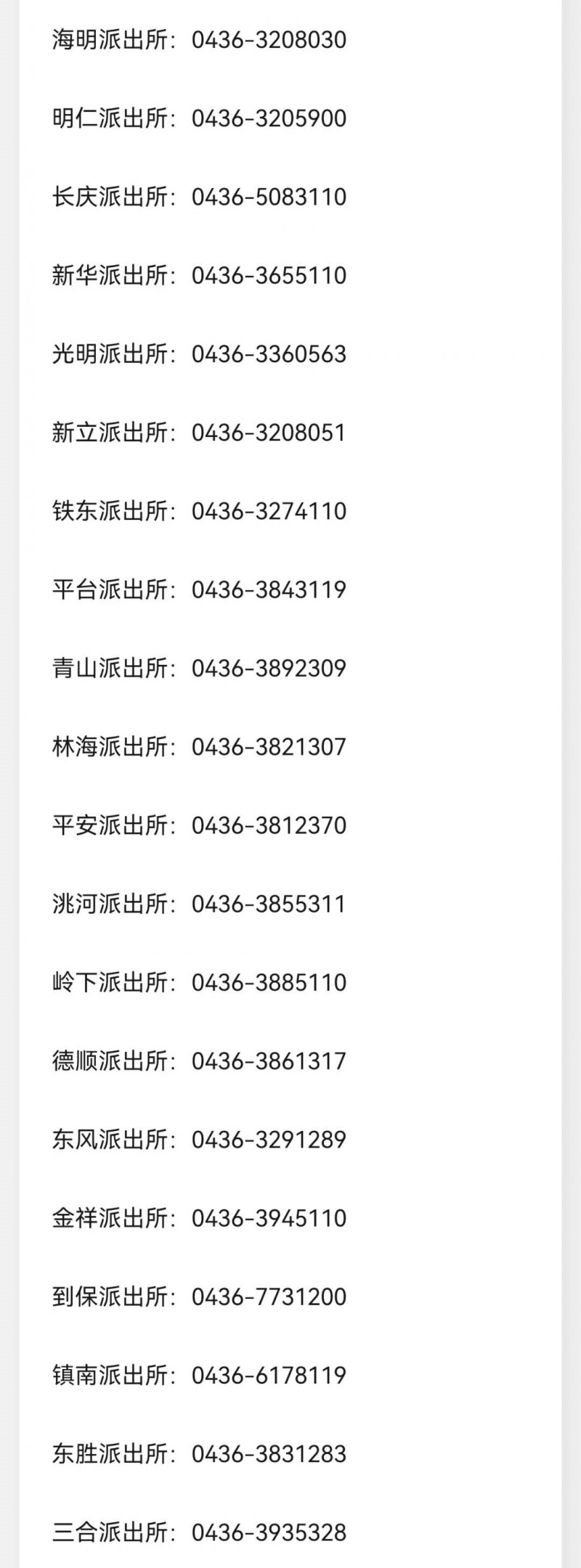 白城市洮北区各辖区派出所户籍户政业务咨询电话号码大全表: