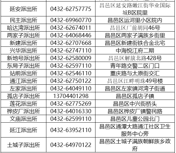吉林市昌邑区各个派出所户政业务咨询服务电话号码大全表: