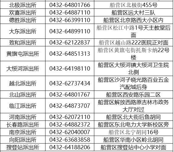 便民黄页:吉林市船营区各辖区派出所户籍户政咨询预约电话号码大全。