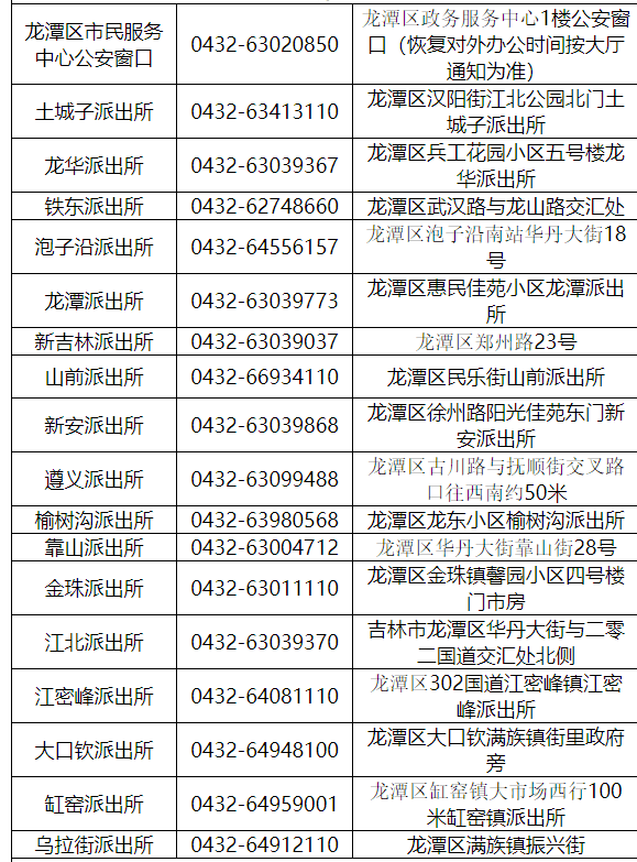 便民信息公开:吉林市龙潭区各个派出所户政户籍咨询预约电话大全。