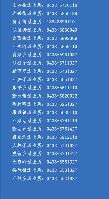 便民黄页:扶余市各个基层派出所值班电话号码大全表。士英街派出所和兴街派出所、育才街派出所、联盟街派出所、铁西街派出所、三岔河派出所、肖家乡派出所、弓棚子派出所、新万发派出所、三井子派出所、永平乡派出所、新源镇派出所、陶赖昭派出所、增盛镇派出所、五家站派出所、新站乡派出所、蔡家沟派出所、大林子派出所、更新乡派出所、长春岭派出所、得胜镇派出所、三骏乡派出所。