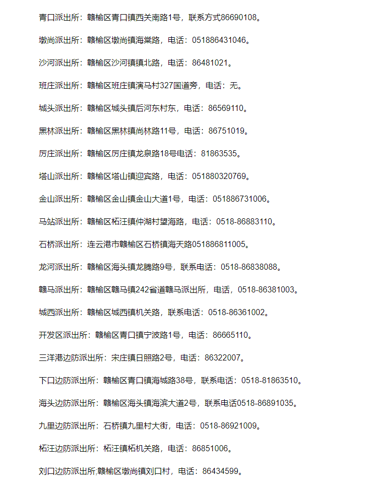 青口派出所:赣榆区青口镇西关南路1号。墩尚派出所:赣榆区墩尚镇海棠路。沙河派出所:赣榆区沙河镇镇北路。