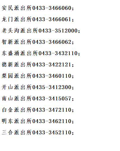 便民黄页:延边州龙井市各派出所值班电话号码大全表。安民派出所;龙门派出所;老头沟派出所;智新派出所;东盛涌派出所;德新派出所;梨园派出所;开山派出所;南山派出所;白金派出所;明东派出所;三合派出所。