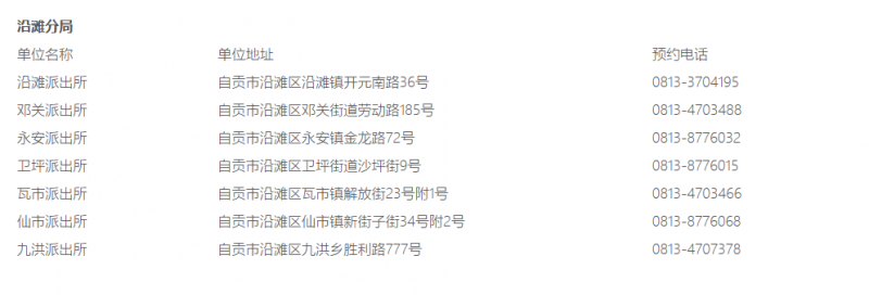自贡市沿滩区各辖区派出所户籍咨询电话号码及办理地址信息汇总表:
