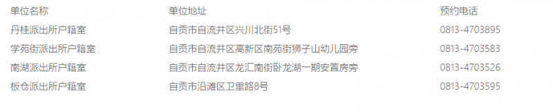 | 南湖派出所户籍室 | 自贡市自流井区龙汇南街卧龙湖一期安置房旁 | 0813-4703526 |