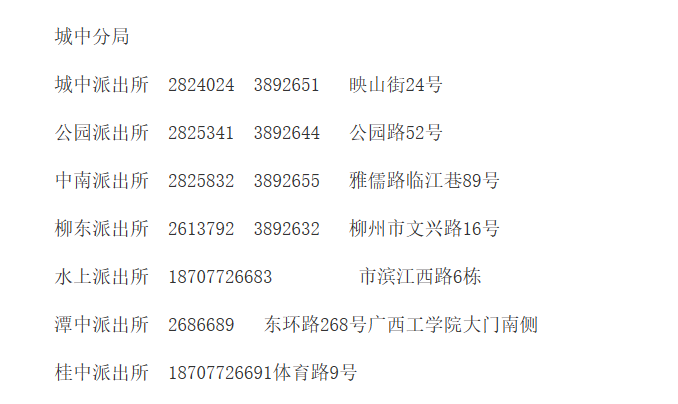 便民黄页:柳州市城中区各个派出所地址和电话大全表。