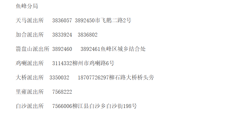 便民黄页:柳州市鱼峰区各个基层派出所值班电话号码汇总表。天马派出所、加合派出所、箭盘山派出所、鸡喇派出所、大桥派出所、里雍派出所、白沙派出所。