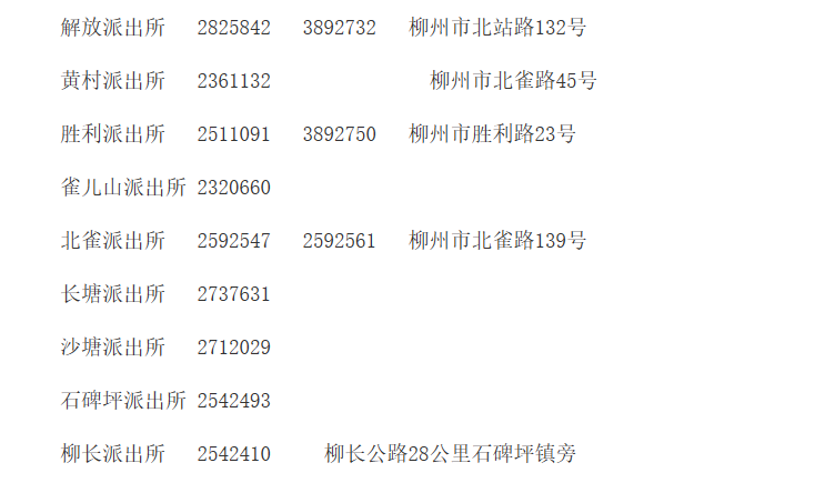 便民黄页:柳州市柳北区基层派出所值班电话号码汇总表:解放派出所、黄村派出所、胜利派出所、雀儿山派出所、北雀派出所、 长塘派出所、沙塘派出所、石碑坪派出所、柳长派出所。