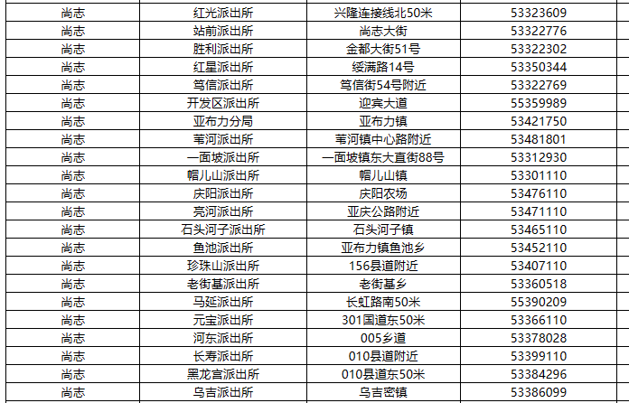 哈尔滨尚志市各派出所办公地址和值班电话大全表: