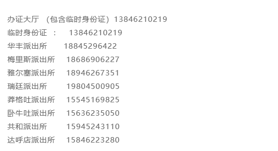 齐齐哈尔市梅里斯区派出所办理户籍户政咨询预约电话大全表:华丰派出所、梅里斯派出所、 雅尔塞派出所、 瑞廷派出所、 莽格吐派出所、 卧牛吐派出所、共和派出所、达呼店派出所。