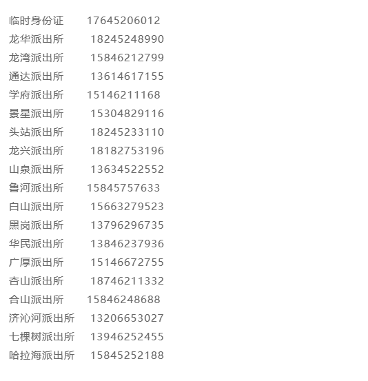 黑龙江省龙江县派出所户籍户政业务咨询预约电话号码大全表:龙华派出所 龙湾派出所 通达派出所 学府派出所 景星派出所 头站派出所 龙兴派出所 山泉派出所 鲁河派出所 白山派出所 黑岗派出所 华民派出所 广厚派出所 杏山派出所 合山派出所 济沁河派出所 七棵树派出所 哈拉海派出所