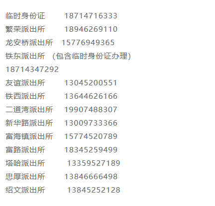 齐齐哈尔市富裕县派出所办理身份证等户籍业务咨询预约电话大全表:繁荣派出所、龙安桥派出所、铁东派出所、友谊派出所、铁西派出所、二道湾派出所、新华路派出所、富海镇派出所、富路派出所、塔哈派出所、忠厚派出所、绍文派出所