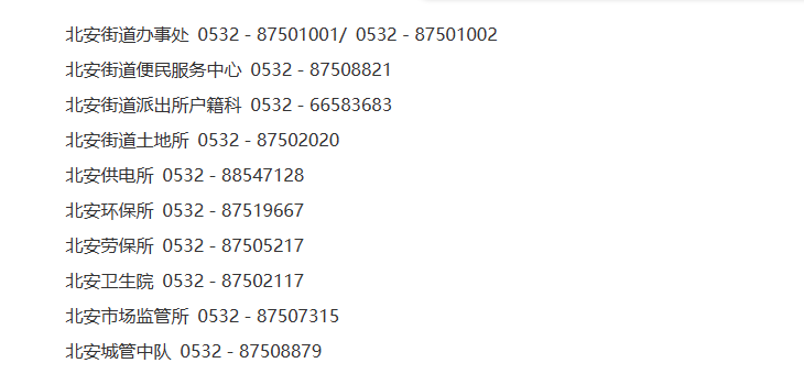 青岛市即墨区北安街道办事处便民电话号码一览表:北安街道办事处 、北安街道便民服务中心、北安街道派出所户籍科、北安街道土地所、北安供电所 、北安环保所、北安劳保所 、北安卫生院 、北安市场监管所 、北安城管中队