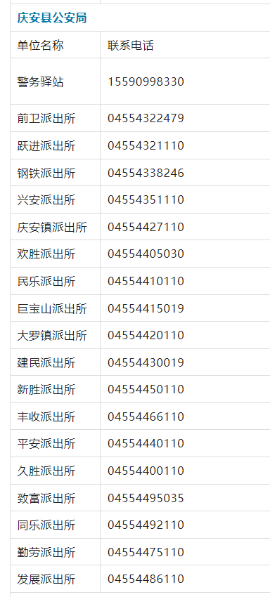 黑龙江庆安县各派出所户政窗口咨询服务电话大全表: