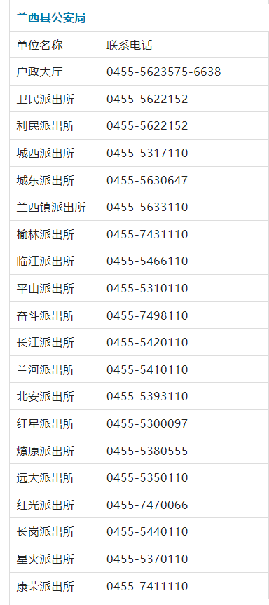 黑龙江绥化兰西县辖区派出所户政业务窗口服务咨询电话号码汇总表