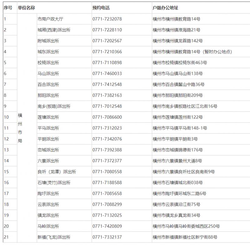 广西南宁横州市派出所户籍窗口服务咨询预约电话地址信息汇总表: