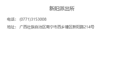 提示:关于南宁西乡塘区新阳派出所地址及电话的信息作出免责提示,本信息发布的目的仅为向公众提供更多的便民利民服务,是建立在公共服务信息基础上的公益信息传播,其信息来源于当地主管机构网站的公开内容。信息不排除因随着时间或者相关情况发生原因而发生变化变更,所以本信息仅作参考。