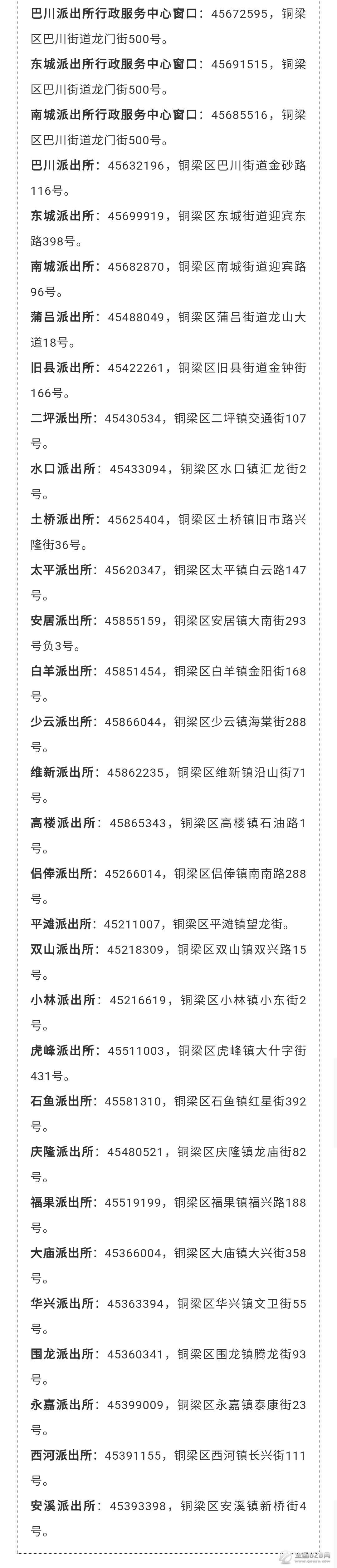 说明:关于重庆市铜梁区各派出所公开电话和办公地址大全表的信息作出免责说明,本信息发布的目的仅为向公众提供更多的便民利民服务,是建立在公共服务信息基础上的公益信息传播,其信息来源于当地主管机构的公开内容。信息不排除因随着时间或者相关情况发生原因而发生变化变更,所以本信息仅作参考。