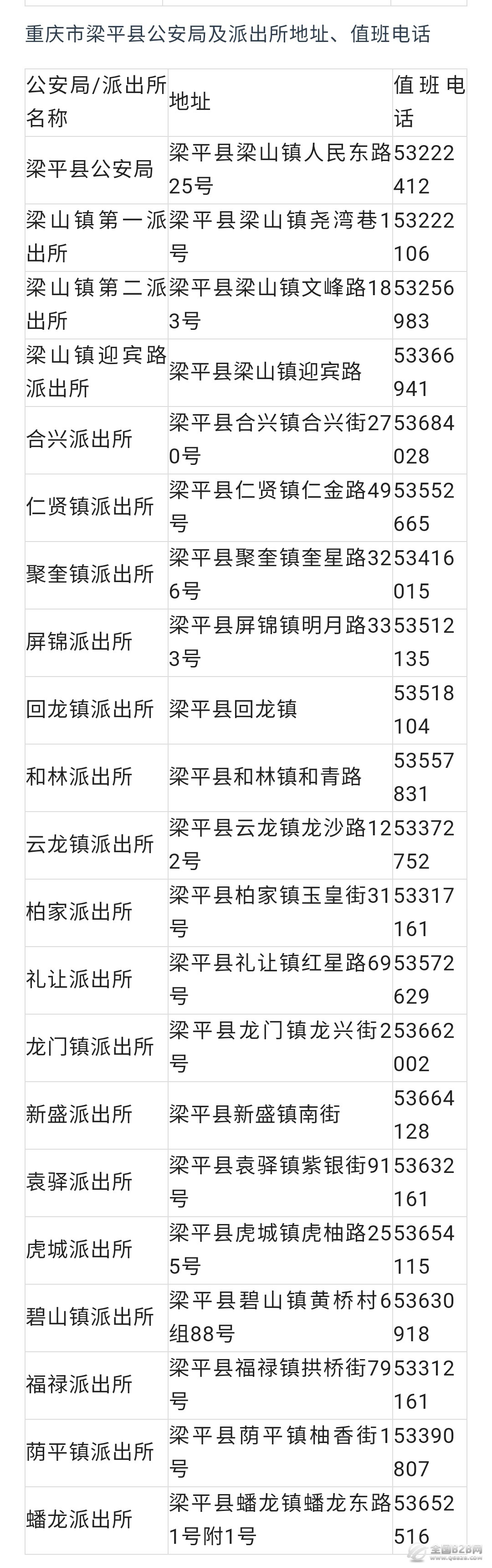重庆市梁平县辖区派出所值班电话和办公地址一览表:生活中,想要办个户口、碰到各类事件等情况,免不了要找派出所。为进一步方便群众办理相关业务,提高办事效率,重庆市梁平县这里汇总了辖区内各派出所详细地址、电话,希望能方便在梁平当地的您!重庆梁平县各派出所值班电话和办公地址一览表如下: