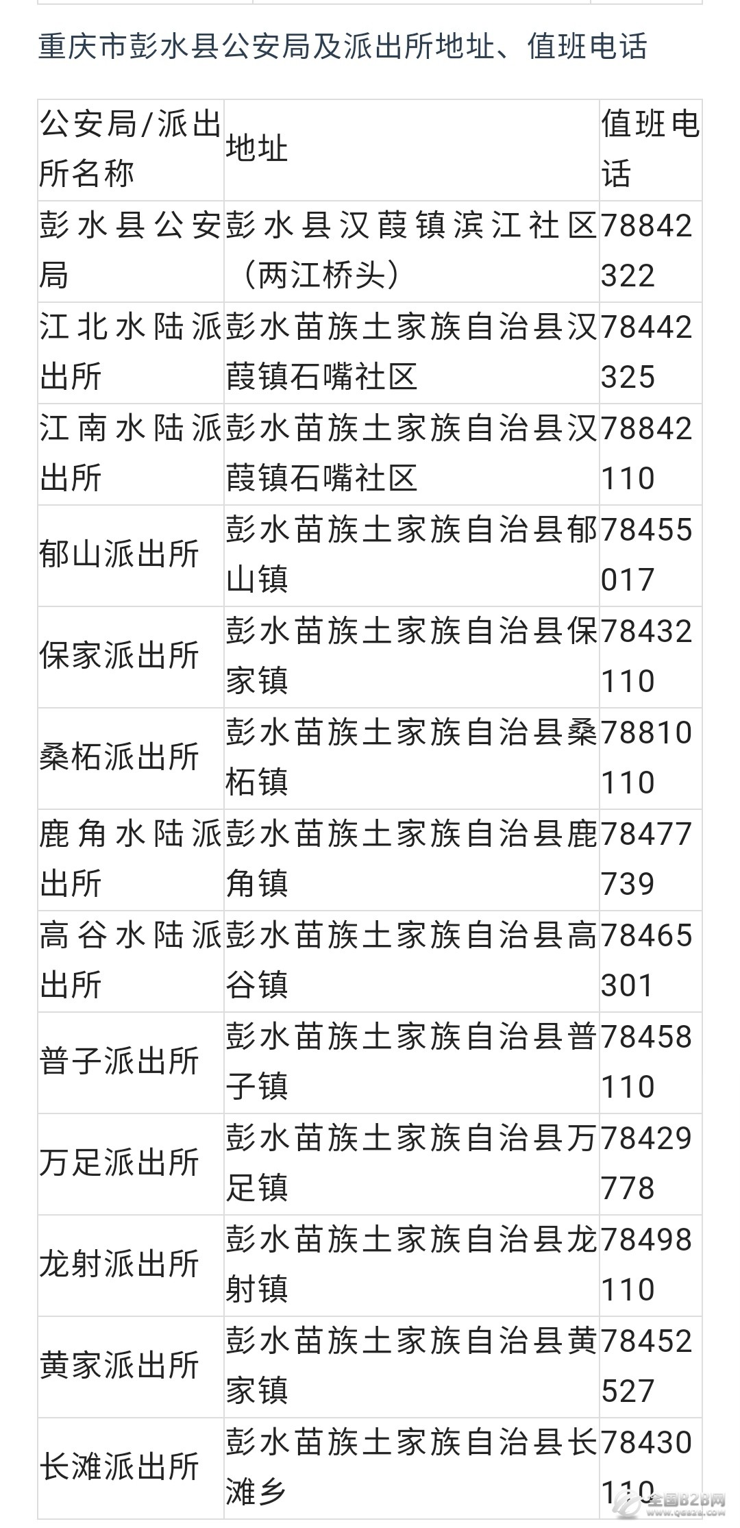 重庆市彭水苗族土家族自治县各派出所值班电话和详细地址汇总表:重庆市辖区彭水苗族土家族自治县各个派出所值班电话和详细地址,有需要可以直接拨打电话。为进一步方便群众,提高处置速度和办事效率,现将彭水县各个派出所值班电话和地址汇总表公布给大家。大家可以按照所在地点直接找到当地派出所,轻轻松松让派出所更快一步赶到你的身边。