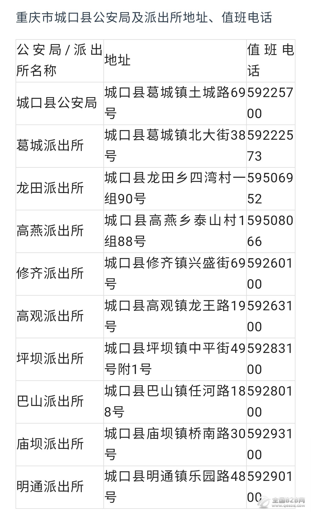 重庆市城口县各派出所地址和值班电话号码一览表:重庆市城口为进一步方便广大人民群众,对辖区派出所电话和地址进行了汇总,现将重庆市城口县派出所电话和地址汇总目录公布给大家,如有需要派出所处理的问题可直接拨打电话,或者直接去派出所咨询办理。重庆市城口县各派出所将以热情地服务、快速地反应、高效地服务,全力提升人民群众安全感满意度。